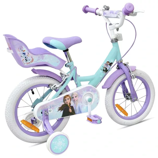 Ez a 14 colos, pótkerekes gyermekkerékpár a Disney Jégvarázs című filmjének Anna és Elsa motívumaival díszített. Türkiz és lila színben első pillantásra egyértelmű: ez egy Jégvarázs kerékpár. Tökéletes választás a filmek rajongóinak, a kis hercegnőknek vagy a nyugtató színeket kedvelő kezdő kerékpárosoknak.