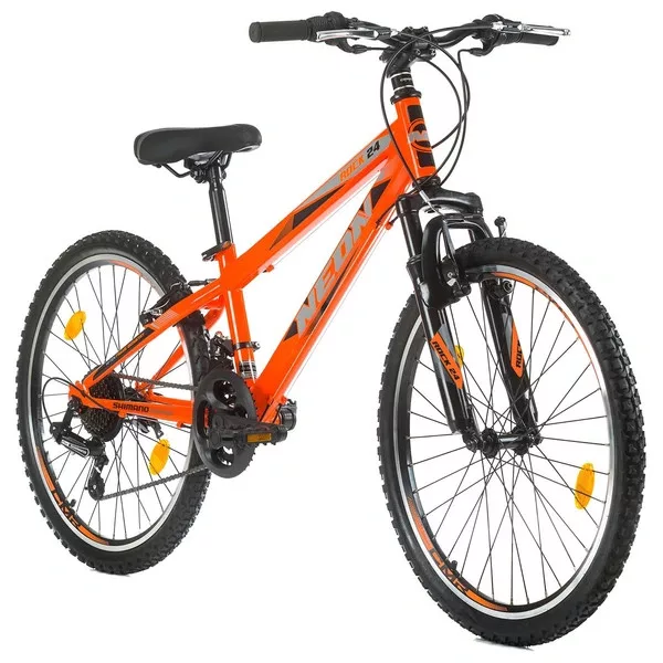 Fedezd fel a természetet ezzel a világos és vagány, 24 hüvelykes, narancssárga Rock gyerek mountain bike-kal! Ez a MTB 21 sebességes hajtáslánccal, sima felfüggesztéssel és pneumatikus gumiabroncsokkal rendelkezik.