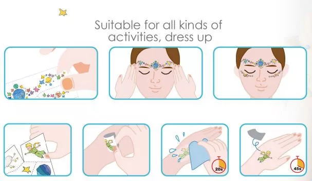 • Könnyen felhelyezhető és eltávolítható: A matricák és tetoválások egyszerűen felhelyezhetők a bőrre, és ugyanolyan könnyen eltávolíthatók, így a gyermekek önállóan is használhatják a készletet.