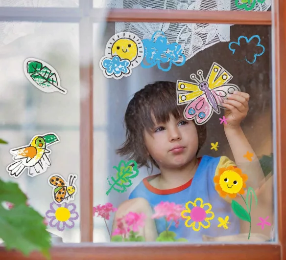 • Könnyen felhelyezhető matricák: A matricák könnyen felhelyezhetők az ablakra, és nyom nélkül eltávolíthatók, így a gyerekek újra és újra alkothatnak.