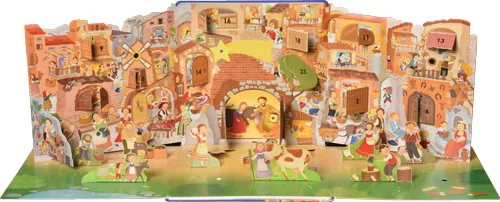 A könyv különleges felépítésű: huszonnégy apró, kinyitható ablak rejti az ünnepi hangulatú képeket, szereplőket és jeleneteket. A lapokból kipattintható figurák a térbeli elrendezéssel együtt egy egészen egyedi, felállítható betlehemmé állnak össze, amely napról napra bővül. A gyerekek maguk helyezhetik el a kis alakokat, díszleteket, így nemcsak követik, hanem alakítják is az adventi történetet. A várakozás végére egy saját kezűleg megépített, fényekkel megvilágított betlehem születik, amely méltó lezárása az ünnepre hangolódásnak.