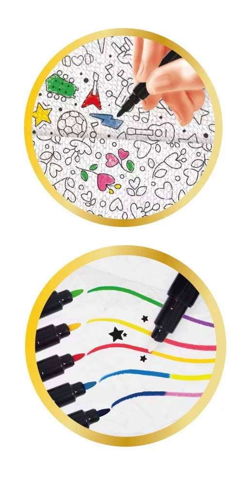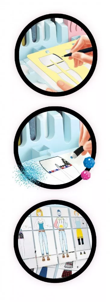 • Számos kiegészítő: A készletben számos kiegészítő található, mint például lámpák, stencilek, csillámok, anyagok, matricák és még sok más, amelyekkel a gyerekek a legkülönlegesebb ruhákat is elkészíthetik.
