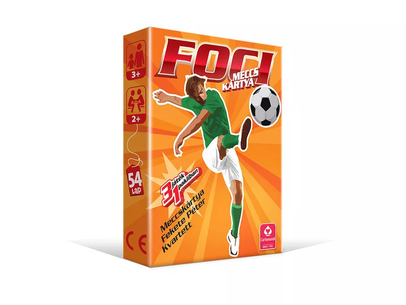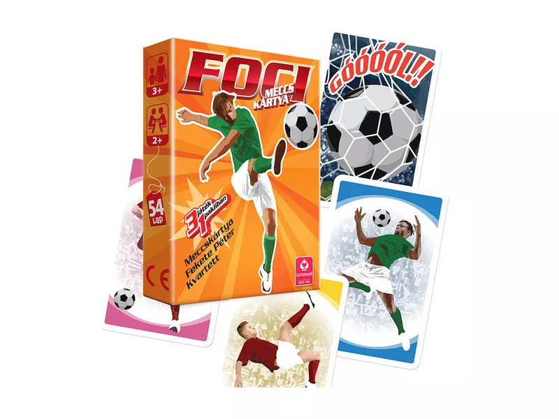 FOCI meccskártya, 3 az 1-ban kártya játék A kártya három különböző szabály szerint, Fekete Péter, kvartett és Meccs kártya játszható. MECCS Kártya: Két csapat egymással szemben, piros és zöld színben, dobókockával felváltva vezetjük a támadást, a kockán lévő színek segítségével, végül egy jól irányzott "dobással" találjuk meg a GÓÓÓL kártyát, és lőjük be a labdát a kapuba! A játék játszható időre vagy gólszámra. A kártyalapok lehelyezésével alakítjuk ki a játékteret, magát a focipályát.