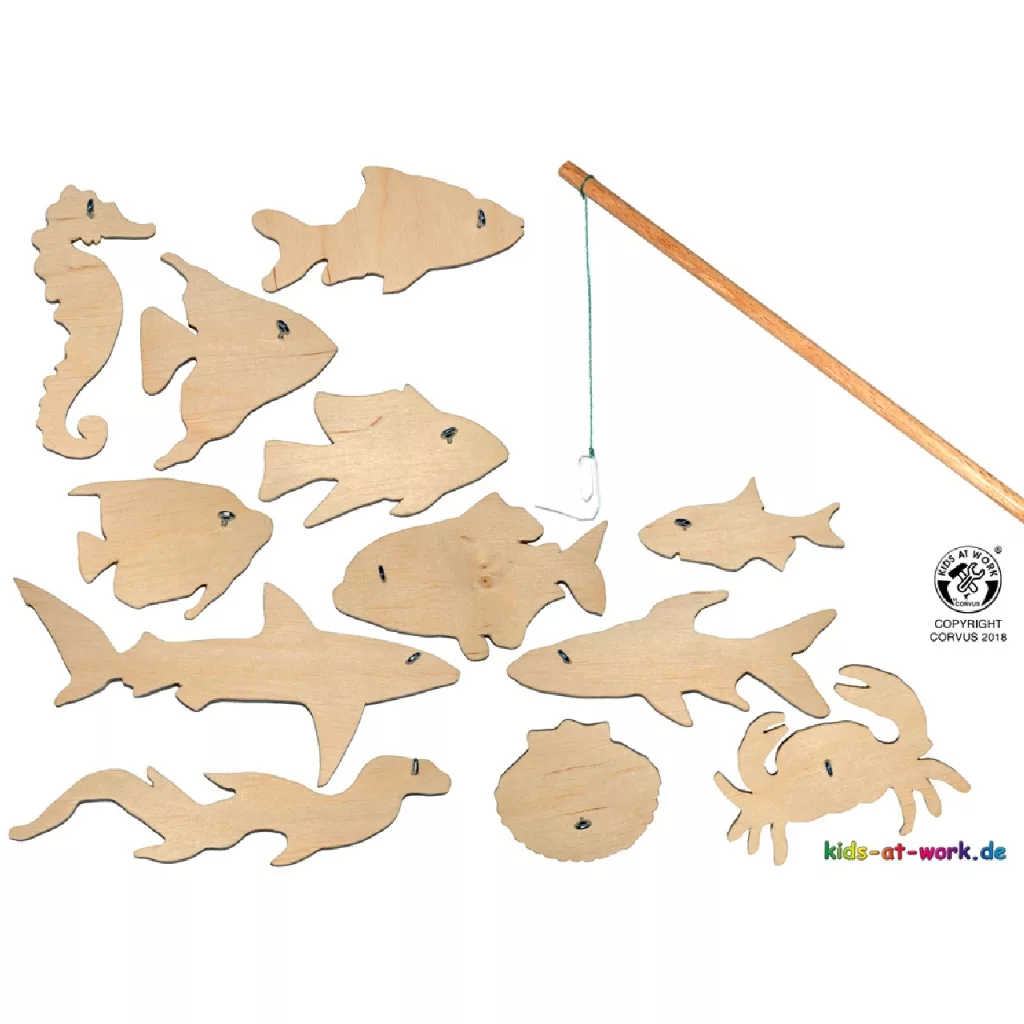 A horgászjáték szettben lévő anyagokból, szerszámok segítségével lehet elkészíteni a játékot. A szettben lévő fa lemezből először a sablon alapján, az indigó segítségével felrajzoljuk a vízi állatokat, amiket egy lombfűrésszel kivágunk. Csiszolópapírral simává tesszük az éleket, behajtjuk a csavarszemeket, elkészítjük a horgászbotot, és kezdődhet a horgászat. A kreatív rész lehet a tengeri állatok díszítése, élethűvé tétele. A kis barkácsolók büszkék lesznek az általuk elkészített játékra. Ajándéknak is kíváló ötlet.