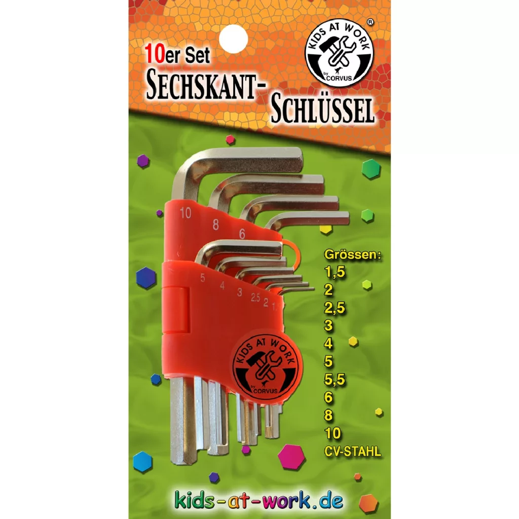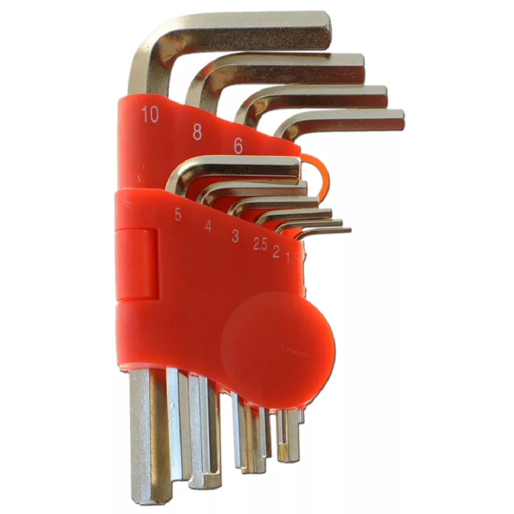 10 CV-os acél imbuszkulcs készlet egy kényelmes és praktikus szerszámtartóban.