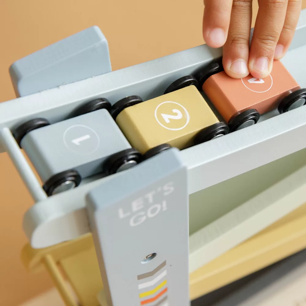 • Kiváló minőségű anyagok: A tartós fából készült pálya és a vízbázisú festés garantálja a játék biztonságát és hosszú élettartamát.