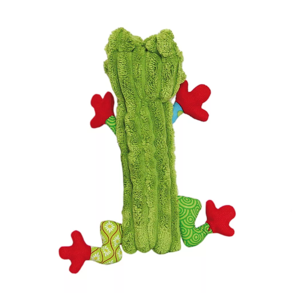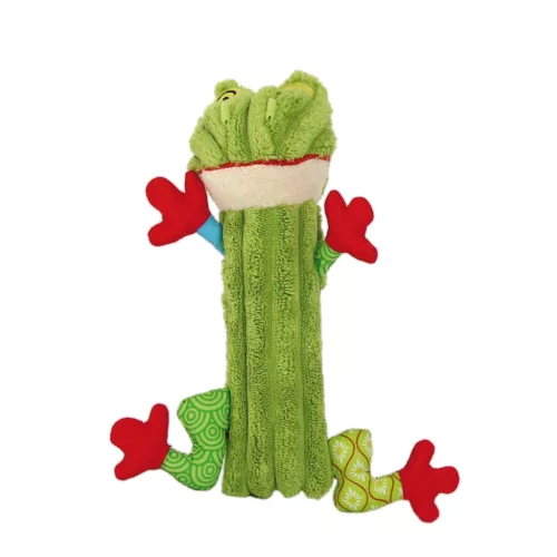 Gyermekkézbe tervezett, dédelgetni, nyomogatni, simogatni való, békát formáló plüssjáték.