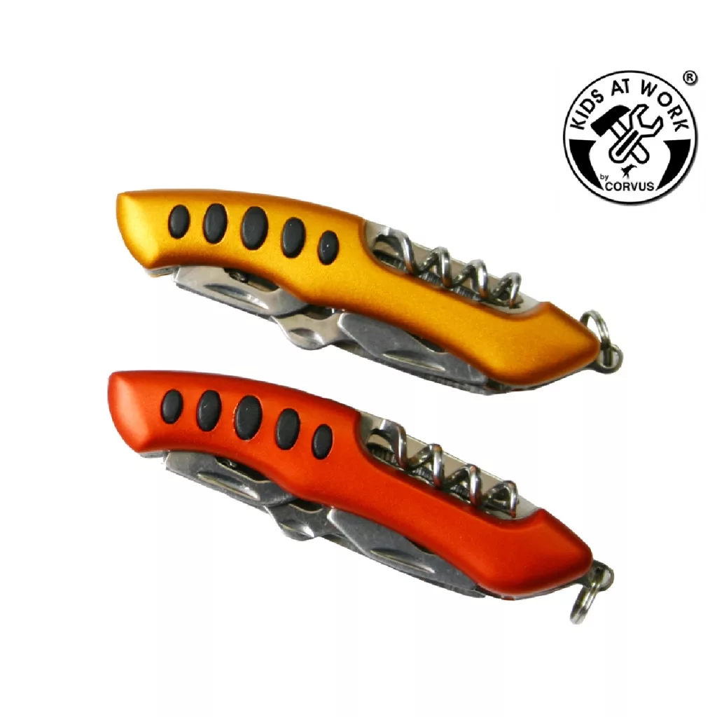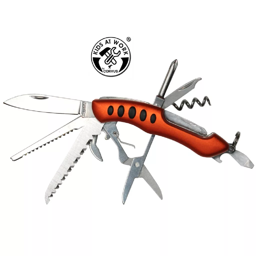 Olló, konzervnyitó, fűrész, késpenge, palacknyitó, dugóhúzó, csillag-csavarhúzó, reszelő, lyukasztó, haltisztító, körömtisztító, fogpiszkáló, csipesz. Jó fogású műanyag nyéllel, csúszásgátló gumibetétekkel.