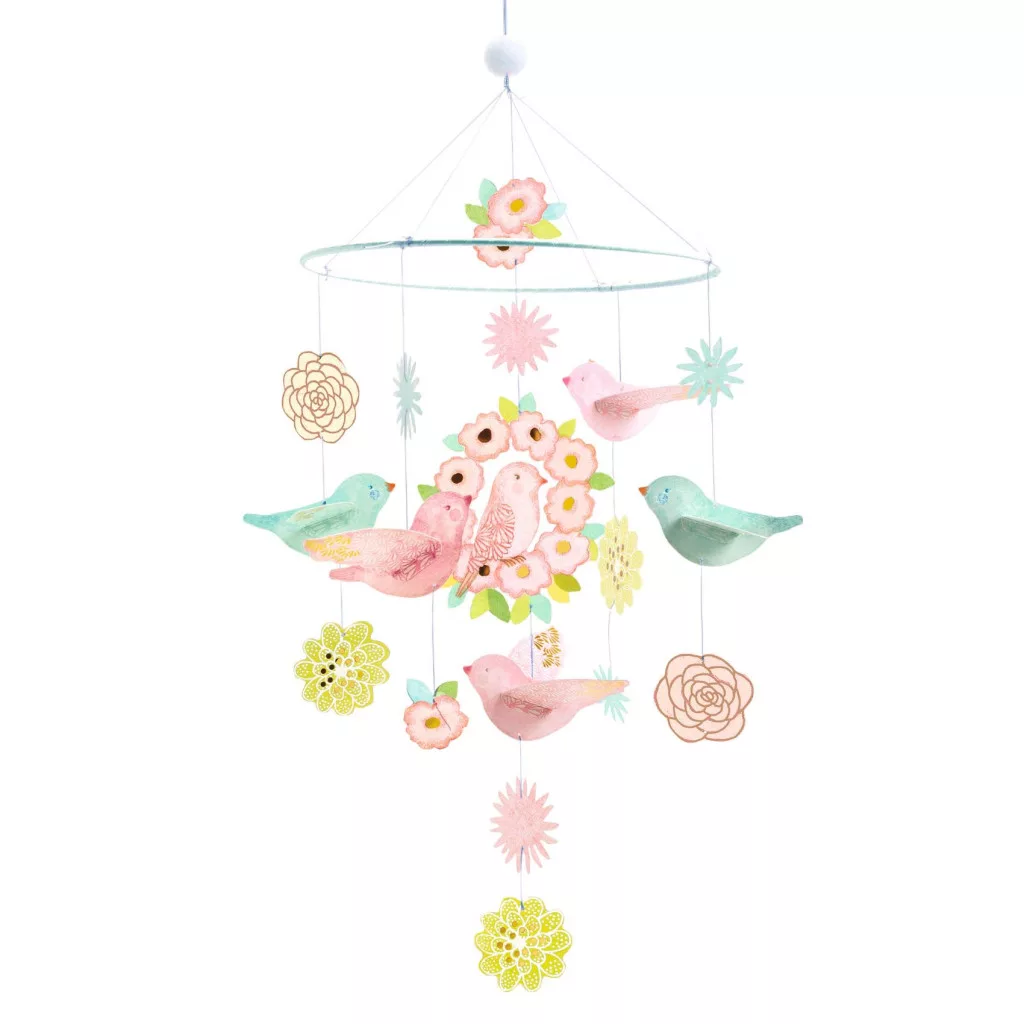 Ez a lágy színű, virágokkal és madarakkal díszített szélmobil gyönyörű dekorációs tárgy a gyermekszobában. Már össze van szerelve, csak annyit kell tennie, hogy rögzíti, és csodálja a levegőben repkedő madarakat. A Djeco Mobiles kollekció két világ, a design és az illusztráció költői és légies találkozása. Finom egyensúlyt teremt az álom és a valóság között. Csillogó illusztrációk aranyszínű kiemelésekkel tündökölnek.