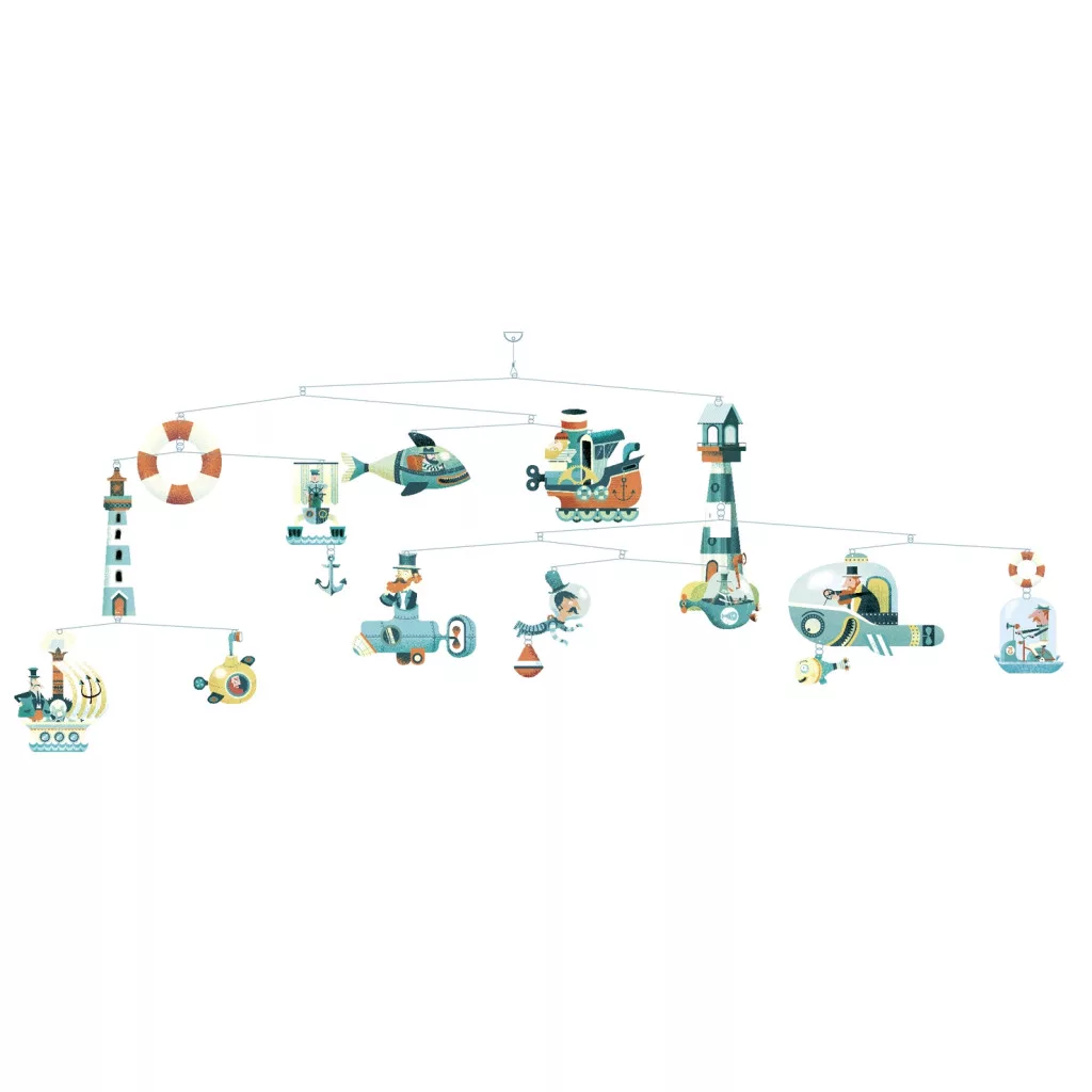 A szélmobil 13 különböző hajózási "objektumot" forgat a szelek szárnyán. A tengeralttjáró, hajó, világítótorony, kékség, szabadságérzet, valódi hajózási élményt rajzol fel a gyerekszoba plafonjára.