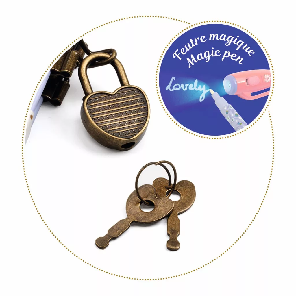 A jegyzetfüzet borítója mesésen gazdagon díszített, mégis könnyeden elegáns. Az élénk és a pasztellszínek arányai harmonikusan széppé varázsolják ezt a titkos naplót. A varázstoll valóban varázsolni tud, egyrészt ezzel lehet írni a láthatatlanná váló betűket, másrészt ennek a tollnak a lámpácskájának fényénél vállnak olvashatóvá a leírt szavak, mondatok, történetek, titkok és élmények. Egy lakathoz két kulcs van, vajon kinek adja oda a naplóíró a titkaihoz a második kulcsot?
