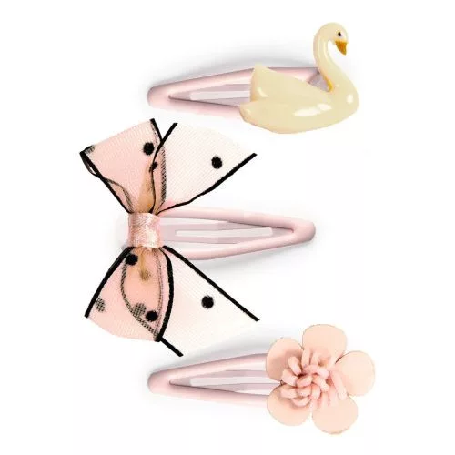 Tartalom: 3 különböző elemmel ellátott fém hajcsat: hattyú (akril), masni (tüll) és virág (műbőr).
