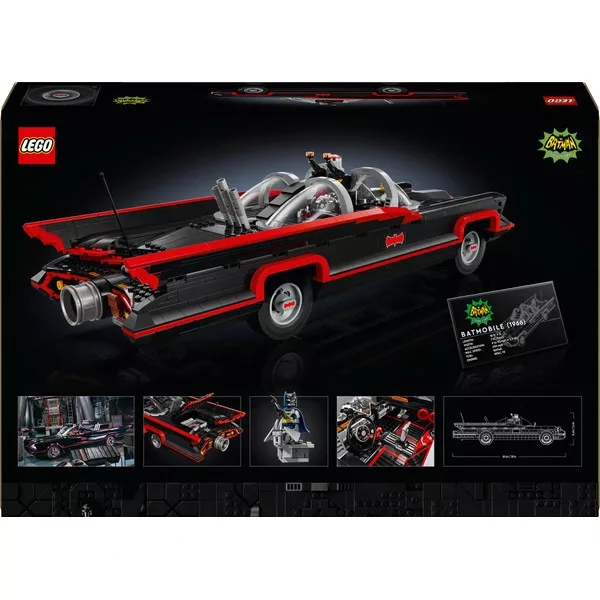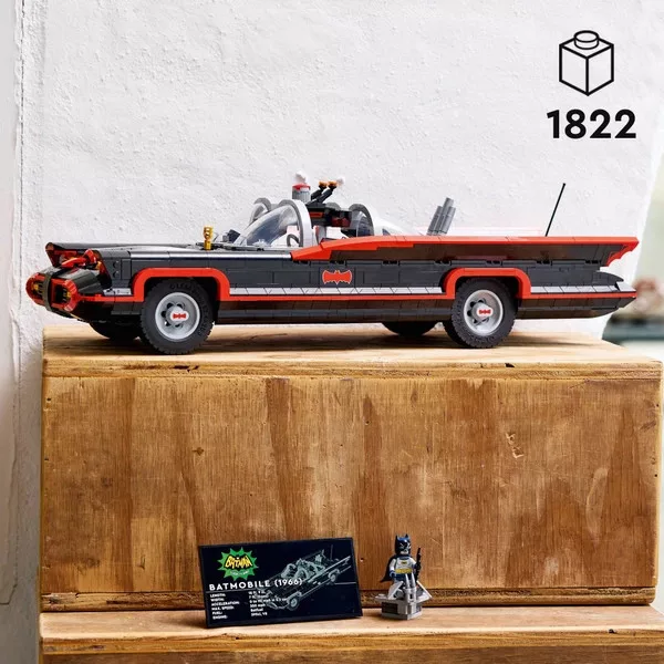 • Ez a látványos DC Super Heroes emléktárgy az 1960-as évekbeli tévésorozat Batmobilján alapul. A jármű szélvédővel, forgó kerekekkel, hiteles részletekkel és egy nyitható csomagtartóval rendelkezik, amelyben a Batmobile számítógép található. A LEGO Batman minifigura az 1960-as évek divatját követi. A Batman akciófigura ikonikus köpenyét és maszkját viseli, és Batarangját tartja a kezében. A gyűjthető figura egy platformon áll, mivel nem fér be a Batman autóba. Az építés megkönnyítése érdekében a LEGO Super Heroes készlet építési útmutatójának digitális változata elérhető a LEGO Builder alkalmazásban.