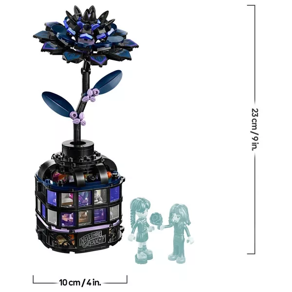 • A LEGO Wednesday Fekete Dália (76784) egy építőjáték és elegáns dísztárgy a 9 éves vagy annál idősebb botanika- és designrajongók számára. Ez a szobadekoráció egy fekete dáliából áll levelekkel és világoslila rügyekkel, valamint egy vázából, amely egy mini télikertet idéz. A gyerekek kivehetik a dáliát a kész modellből, hogy kinyitsák a vázát és felfedezzék a benne elrejtett tantermet. A tanteremben levehető padok, egy szék és egyéb kiegészítők találhatók számtalan történethez. A két minibaba figura, Wednesday Addams és Marilyn Thornhill (a Wednesday botanikatanára), végtelen szerepjáték-kalandokra hívja a gyerekeket.