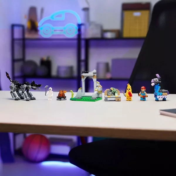 • Ez a játékkészlet a LEGO Fortnite Odyssey videojátékban a játékosokkal szembesülő első kihívások ihlették. Fiúk és lányok egyaránt remekül fogják szórakozni a tábortűz, a munkapad és a romok megépítésével és újjáépítésével. Egy ellátmányláma és egy mozgatható farkú és lábú farkas is fantáziadús játékra ösztönöz. Három minifigura – Shali, a Gyertyaművész és egy Csontváz – kelti életre az akciót. A minifigurák kiegészítői pedig rengeteg anyagot biztosítanak a fantáziadús szerepjátékhoz.