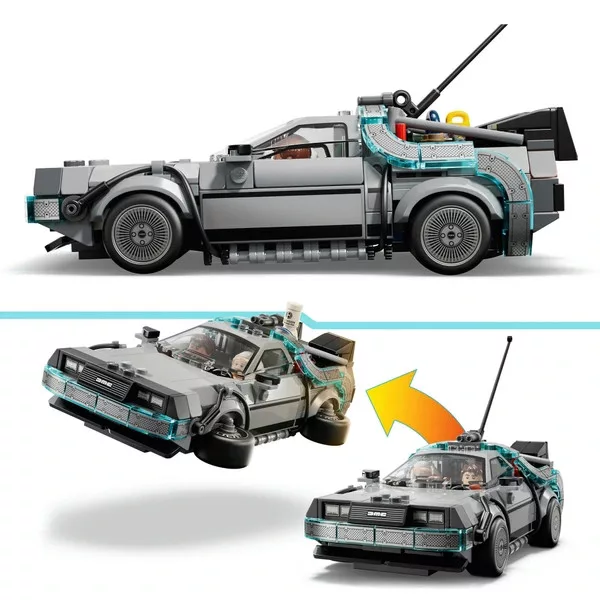 • Építsd meg az ikonikus LEGO DeLoreant az első filmből ismert villámhárítóval és kaliforniai rendszámtáblával, majd alakítsd át a második film repülő változatává – fúziós generátorral, narancssárga rendszámtáblával és lehajtható kerekekkel kiegészítve. Mindkét verzióban találhatók hátsó szellőzőnyílások, pilótafülke, fluxuskondenzátor és óra.