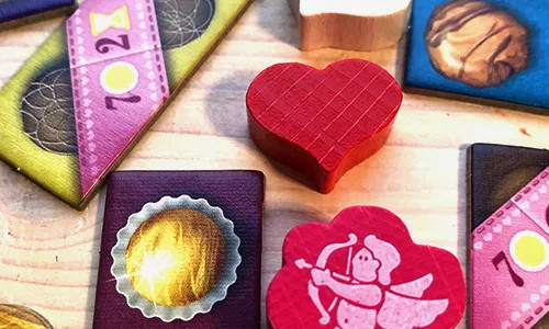 A doboz tartalma: 1 semleges jelző, 2 szívjelző, 5 apró sütemény, 1 különleges lapka, 1 központi időtábla, 2 doboztábla, 33 csokielem és egy játékszabály.