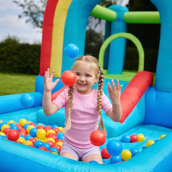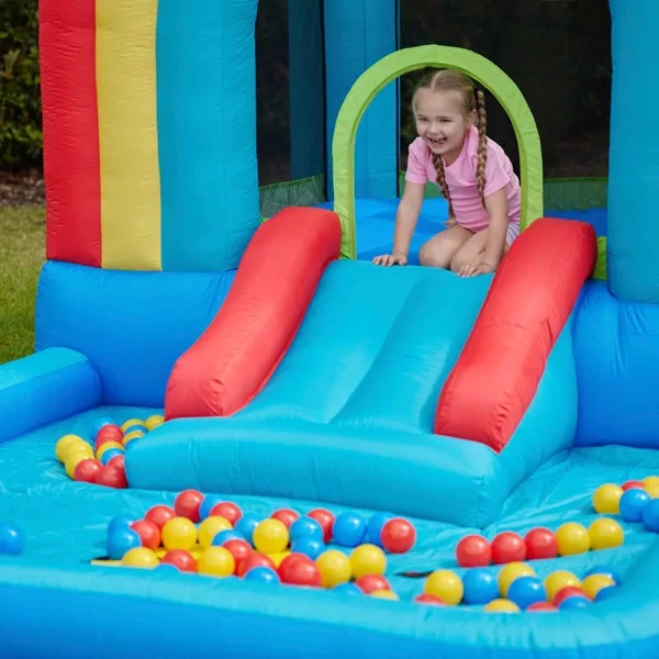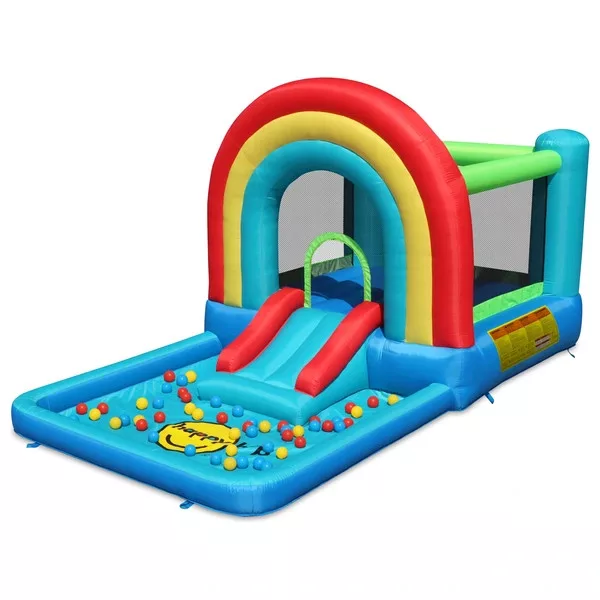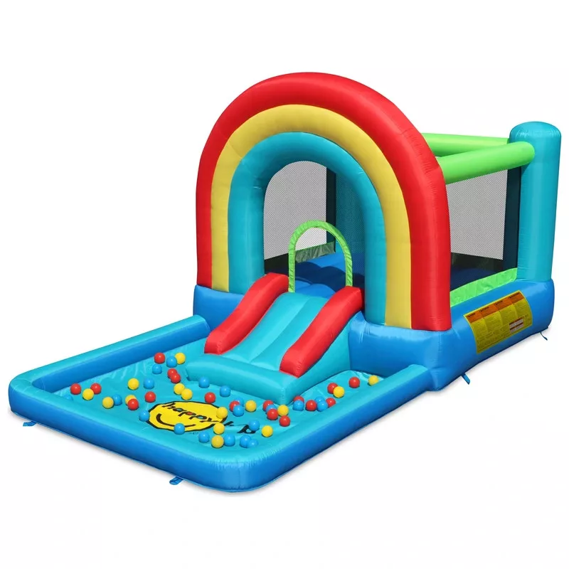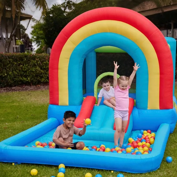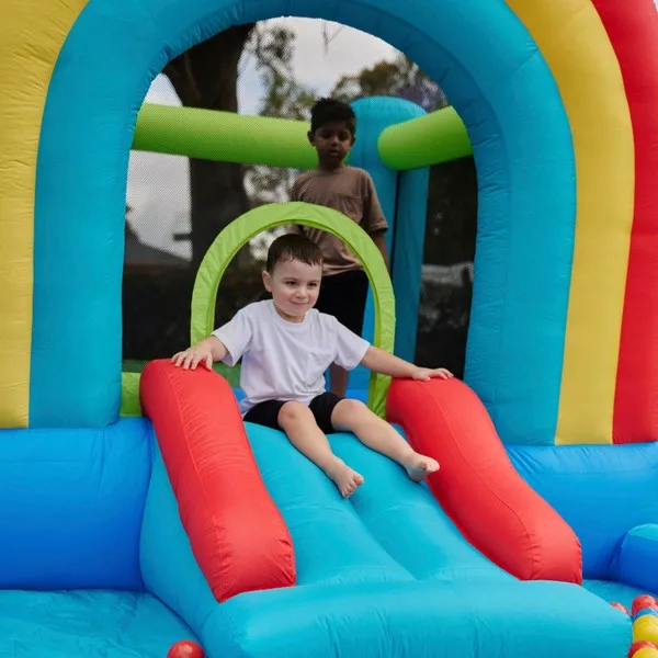 Szivárványszínű ugrálóvár csúszdával és labdamedencével
